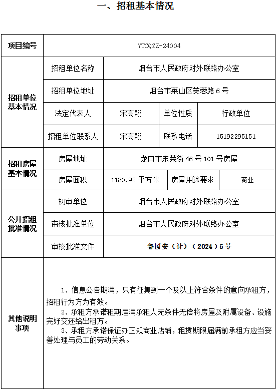煙臺(tái)市南大街267號(hào)一樓東側(cè)門(mén)頭房招租公告